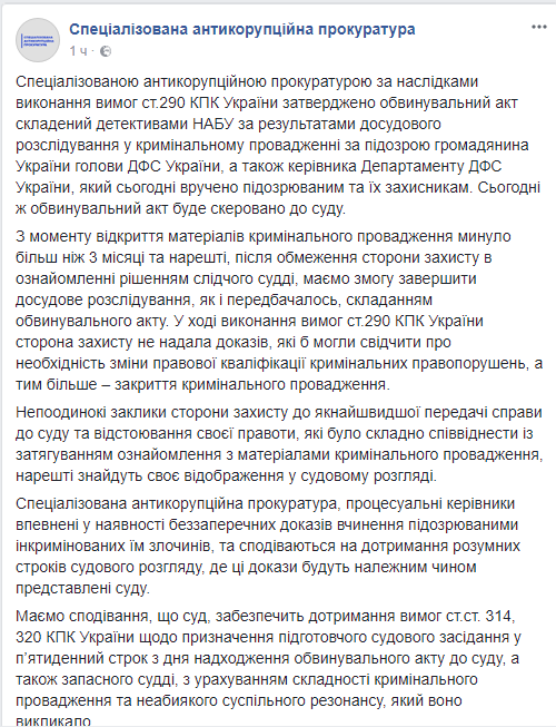 В САП уточнили, что с момента открытия материалов уголовного производства прошло более 3 месяцев, но благодаря ограничению сроков ознакомления с материалами дела наконец был составлен обвинительный акт.