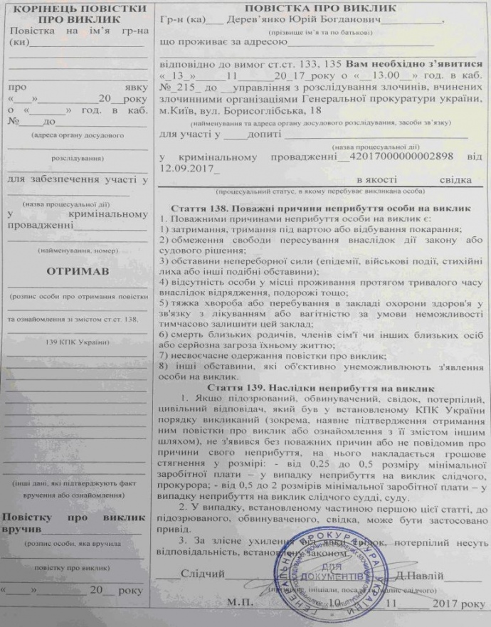 По ее словам, это уже не первая повестка депутату – на предыдущие несколько вызовов Деревянко не являлся.