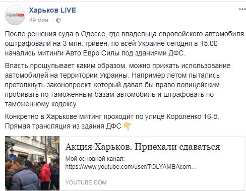 "После решения суда в Одессе, где владельца европейского автомобиля оштрафовали на 3 млн. гривен, по всей Украине сегодня в 15:00 начались митинги Авто Евро Силы под зданиями ГФС, - пишет в Facebook Харьков LIVE.