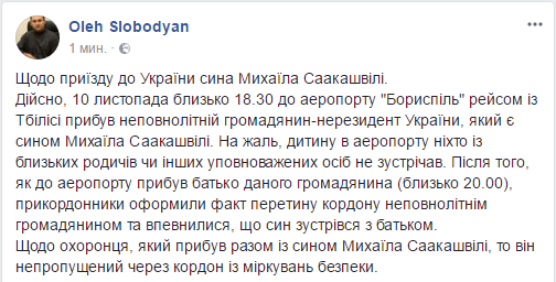 "10 ноября около 18.30 в аэропорт "Борисполь" рейсом из Тбилиси прибыл несовершеннолетний гражданин-нерезидент Украины, который является сыном Михаила Саакашвили. К сожалению, ребенка в аэропорту никто из близких родственников или иных уполномоченных лиц не встречал. После того, как в аэропорт прибыл отец данного гражданина (около 20.00), пограничники оформили факт пересечения границы несовершеннолетним гражданином и убедились, что сын встретился с отцом", - написал Слободян.