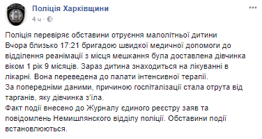 Информация о случившемся внесена в журнал единого реестра заявлений и сообщений Немышлянского отдела полиции Харькова. Обстоятельства происшествия устанавливаются.