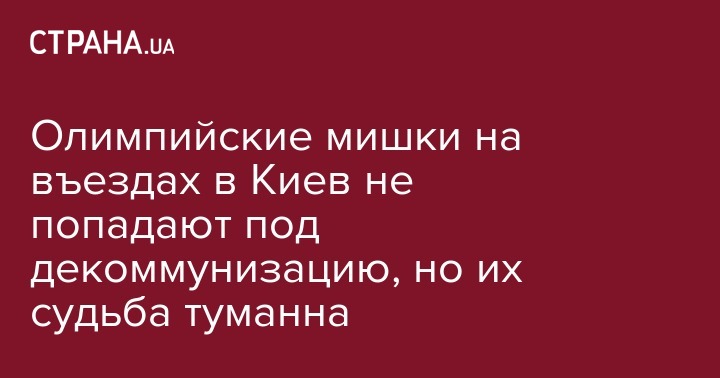 Олимпийские мишки на въездах в Киев (на Житомирской, Одесской и Бориспольской трассах) не попадают под декоммунизацию, их судьбу решат местные власти. Правда, оказалось, что скульптуры бесхозные и не числятся на балансе предприятий.