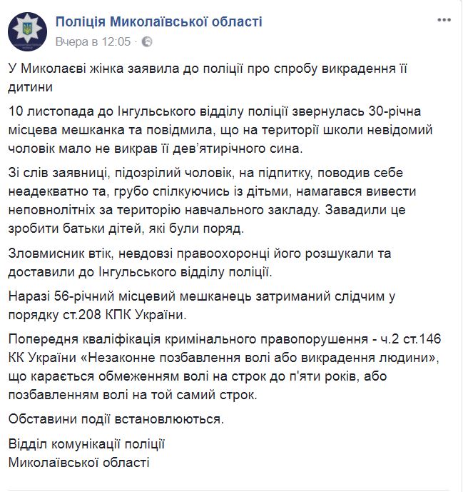 В Николаеве на территории школы 56-летний мужчина пытался похитить 9-летних мальчиков. Об этом сообщает отдел коммуникации Главного управления Нацполиции Николаевской области в Facebook.