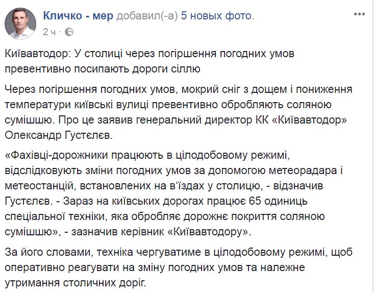 "Специалисты-дорожники работают в круглосуточном режиме, отслеживают изменения погодных условий с помощью метеорадар и метеостанций, установленных на въездах в столицу. Сейчас на киевских дорогах работает 65 единиц специальной техники, которая обрабатывает дорожное покрытие соляной смесью", - заявил руководитель "Киевавтодора ".
