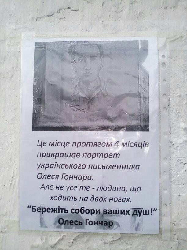 "Сказать, что это больно, – это не сказать ничего. Сегодня у нас фактически траур. Потому что каждая локация рождается в муках и ее лелеют, как ребенка. Нам пришлось зарисовать портрет. Мы не знаем, кто испортил портрет Гончара, почему и за что. Скорее всего, "просто". Потому что люди преимущественно, простите, быдло. И, даже не имея иллюзий по этому поводу, каждый раз удивляешься, как еще можно пробить дно", – написала активистка.