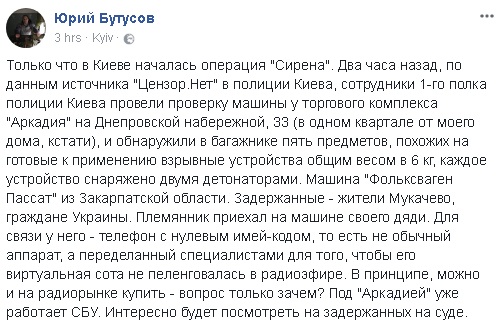 Как пишет журналист Юрий Бутусов на своей странице в Facebook, в одном квартале от его дома, правоохранители обнаружили в багажнике пять предметов, похожих на готовые к применению взрывные устройства общим весом в 6 кг, каждое устройство снаряжено двумя детонаторами.