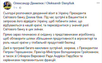 "Сегодня начался двухдневный визит в Украину Президента Всемирного банка Джима Кима. Во время встречи в Вашингтоне я пригласил его посетить Украину, чтобы увидеть изменения, происходящие в нашей стране, и убедиться в значительной роли Всемирного банка в этих изменениях.
