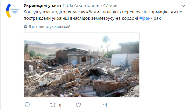 "Консул во взаимодействии со спасательными службами и полицией проверяет информацию, есть ли пострадавшие среди украинцев в результате землетрясения на границе Ирана и Ирака", - говорится в сообщении.