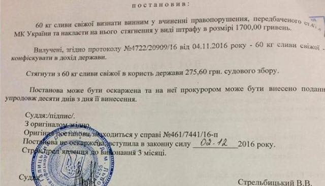Действия гражданина Украины квалифицировали, как правонарушение, предусмотренное ст.471 ТК Украины, впрочем, в постановлении суда вместо украинца виновной признали 60 кг сливы.