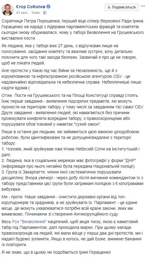 Также Соболев прокомментировал возмущение вице-спикера Рады Ирины Геращенко, которой не нравятся посты, выставленные на МихоМайдане на Грушевского.