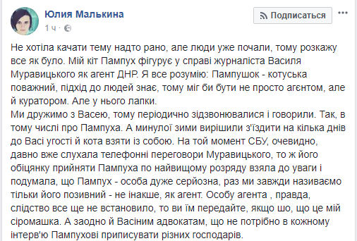 Хозяйка кота Пампуха, которого СБУ записала в "агенты ДНР" по делу журналиста Василия Муравицкого, подтверждает, что ее кот очень "почтеный" и мог быть "не просто агентом, но и куратором". Об этом родственница житомирского журналиста Юлия Малькина рассказала в Facebook.