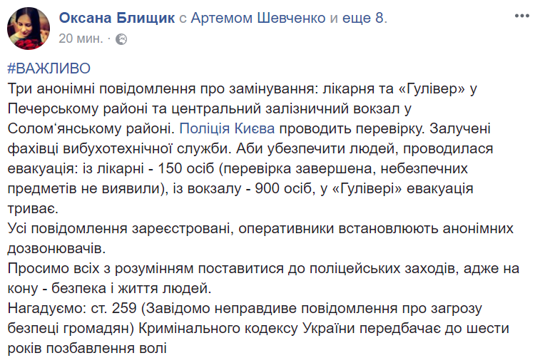 По данным спикера киевской Нацполиции Оксаны Блищик, помимо вокзала и "Гулливера" эвакуируется одна из больниц Печерского района столицы.