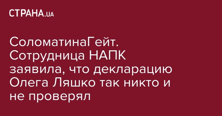 "Проверка декларации Олега Ляшко должна была состояться еще в феврале, но, по состоянию на май, когда проверка должна была уже закончиться, она так и не была проведена. В итоге оказалось, что декларацию Ляшко так никто и не проверял", - заявила сегодня жерналистам Соломатина. Это следует из видеозаписи, размещенной в Facebook нардепом Викторией Войцицкой.