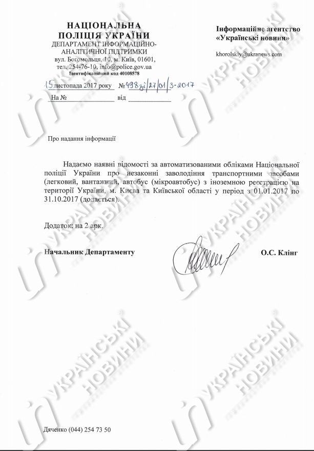 Национальная полиция Украины зафиксировала 294 случая незаконного завладения транспортными средствами (легковой, грузовой, автобус и микроавтобус) с иностранной регистрацией на территории Украины, города Киева и Киевской области в период с 1 января по 31 октября 2017 года.