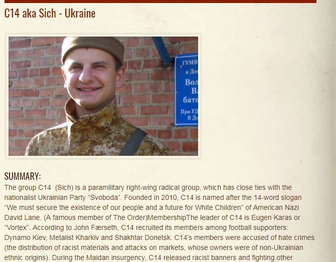 "Группа С14 (Сич) - это полувоенная правоцентристская (на самом деле С14 является ультраправой организацией - Прим.Ред.) радикальная группа, которая имеет тесные связи с националистической украинской партией "Свобода", - отмечается в сообщении.