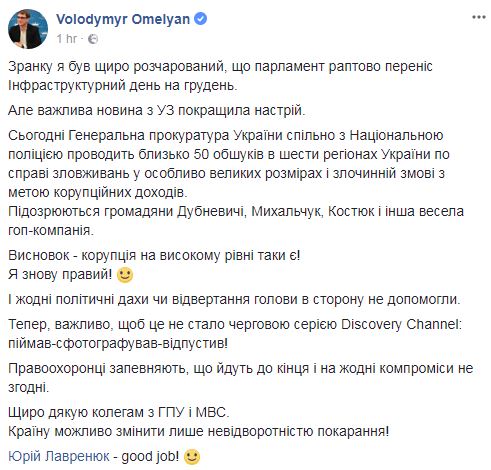 "Утром я был искренне разочарован, что парламент внезапно перенес "инфраструктурный день" на декабрь. Но важная новость с УЗ улучшила настроение. Сегодня Генеральная прокуратура Украины совместно с Национальной полицией проводит около 50 обысков в шести регионах Украины по делу злоупотреблений в особо крупных размерах и преступном сговоре с целью коррупционных доходов", - отметил он.