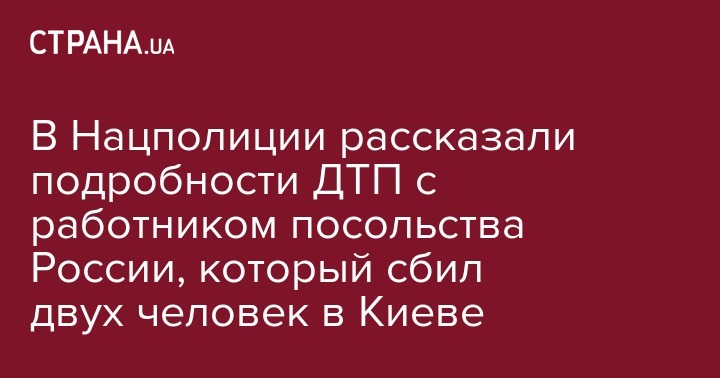 Пресс-секретарь Нацполиции Ярослав Тракало подтвердил, что работник посольства России в центре Киева сбил двух человек. Инцидент произоше на пешеходном переходе.