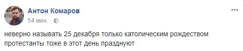 Блогер Антон Комаров напоминает: "Неверно называть 25 декабря только католическим Рождеством. Протестанты тоже в этот день празднуют".