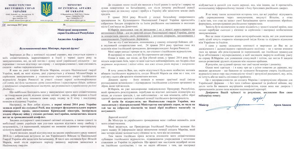 "В связи с отклонением судом ходатайства В. Маркива об изменении меры пресечения на домашний арест, направил письмо уважаемому министру иностранных дел Италии - с целью обратить внимание на факты, и призвать к объективного и непредвзятого суда", - написал Аваков.