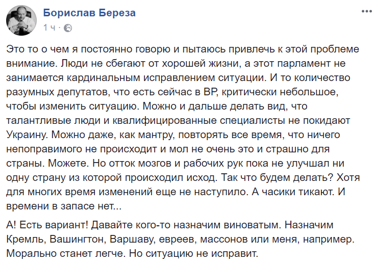"До тех пор, пока реформаторы не переведут своих детей в украинские школы, я не верю в искренность ни одной из реформ. Они реформируют медицину, а сами летаю на лечение в Вену или в Израиль. Туда же возят пачками свих тещ и свекровей. Они рассказывают нам про светлое будущее, а детей учат в Британии и в Америке. Вот представьте себе. Вечер. Папа Петя или папа Вова звонят своей дочке Мане или Кате. У нее закончились занятия в колледже. И вот она делится новостями: о любимых предметах в британской школе. Об экскурсии в местный европейский музей, и что ели на обед, и какая учительница - самая интересная. Из этих рассказов папа складывает впечатление о школе, хорошо там, или нет. Его касается, ему важно. А если его не касается? Ему важно? Зная специфику этих людей - им плевать, раз их не касается".