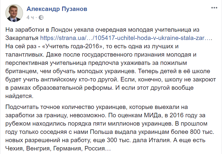 "Молодые и талантливые делают свой выбор не в пользу Украины. Они уезжают из страны, потому что хотят получать достойное вознаграждение за свой труд и чувствовать себя в безопасности. Развиваться, реализовывать себя и жить, а не бороться за существование", - написал Пузанов в Facebook.
