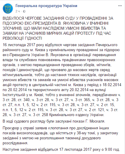 Как сообщает пресс-служба Генпрокуратуры, на заседании в четверг суд заслушал показания главы Закарпатской облгосадминистрации Геннадия Москаля. Затем прокурор по делу заявил ходатайство об исследовании других показаний чиновников, содержащихся в 38-м томе материалов, в закрытом заседании с целью неразглашения тайны досудебного расследования.
