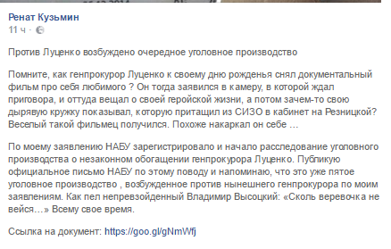 "По моему заявлению НАБУ зарегистрировало и начало расследование уголовного производства о незаконном обогащении генпрокурора Луценко. Публикую официальное письмо НАБУ по этому поводу и напоминаю, что это уже пятое уголовное производство, возбужденное против нынешнего генпрокурора по моим заявлениям", - написал Кузьмин в Facebook.
