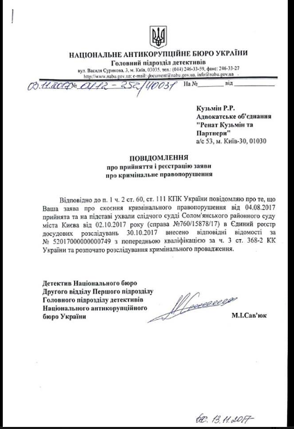 Кузьмин также опубликовал на своей странице в соцсети ответ НАБУ, в котором сообщается, что "на основании решения следственного судьи Соломенского районного суда города Киева от 02.10.2017 года в Единый реестр досудебных расследований 30.10 2017 внесены соответствующие сведения, <...> и начато уголовное производство".