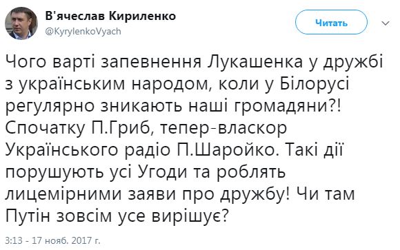 "Чего стоят заверения Лукашенко в дружбе с украинским народом, когда в Беларуси регулярно исчезают наши граждане?! Сначала Павел Гриб, теперь - собкор Украинского радио Павел Шаройко. Такие действия нарушают все соглашения и делают лицемерными заявления о дружбе! Там Путин совсем все решает?", - написал Кириленко в Twitter.