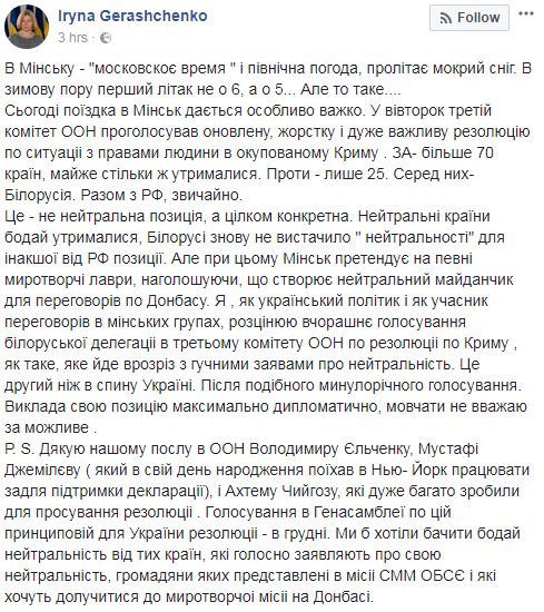 14 ноября Беларусь, по выражению вице-спикера Ирины Геращенко, "воткнула второй нож в спину Украины". Минск в ООН проголосовал против резолюции Украины по нарушению прав человека в Крыму.