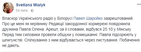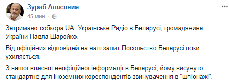 "Задержан собкор "UA:Украинское Радио" в Беларуси, гражданин Украины Павел Шаройко. По нашей собственной неофициальной информации в Беларуси, ему предъявлено стандартное для иностранных корреспондентов обвинение в "шпионаже", - говорится в Facebook Аласании.