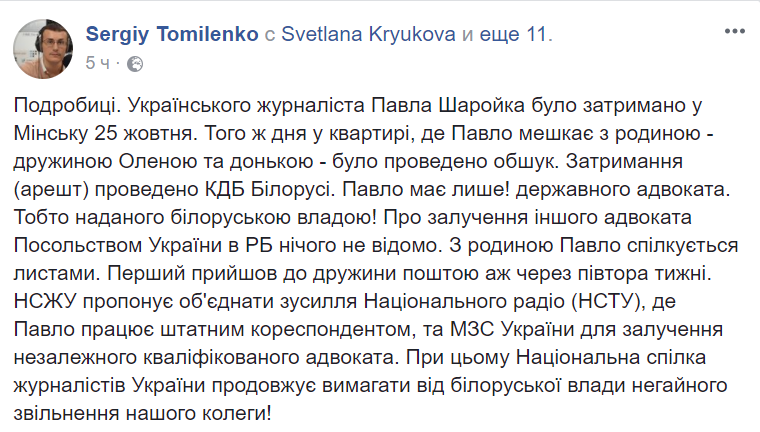 В Национальном союзе журналистов призвали минские власти освободить Павла Шаройко. Глава НСЖУ Сергей Томиленко рассказал, что в Минске у журналиста сейчас жена и дочь. Шаройко предоставлен белорусский государственный адвокат, и НСЖУ сейчас ищет ему другого защитника.