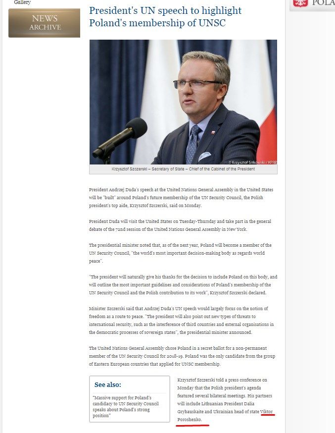 Также Виктором Порошенко назвали в сообщении о выступление президента ООН, в котором говорится о повестке дня президента Польши, в частности о встрече с "главой украинского государства Виктором Порошенко".