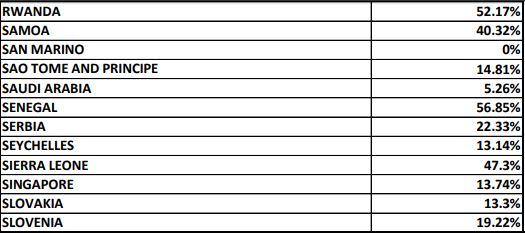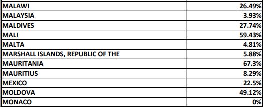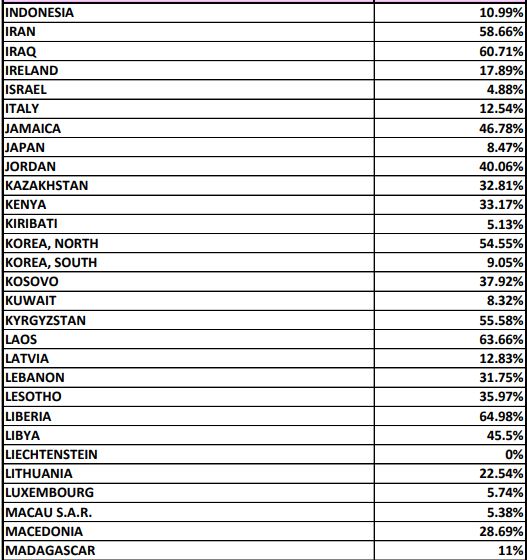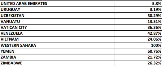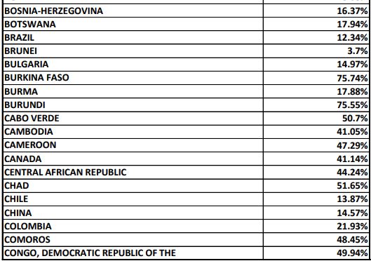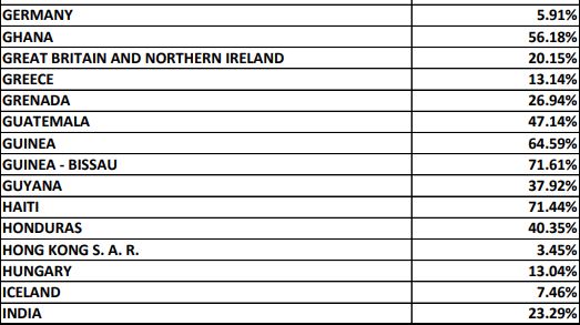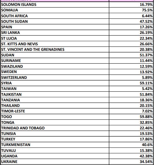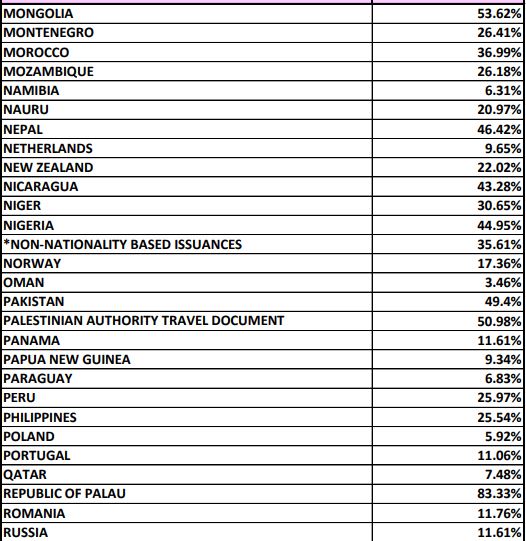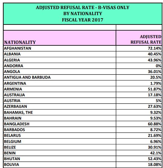 Больше всего США отказывают в визах жителям Федерального штатов Микронезии и Западной Сахары (доля отказов - 100%), а также Республики Палау (83,33%), Кубы (77,17%), Бурунди (75,55%), Буркина -Фасо (75,74%), Сомали (75,5%), Афганистана (72,14%), Эритрее (71,69%), Гаити (71,44%), Гамбии (70,27%).