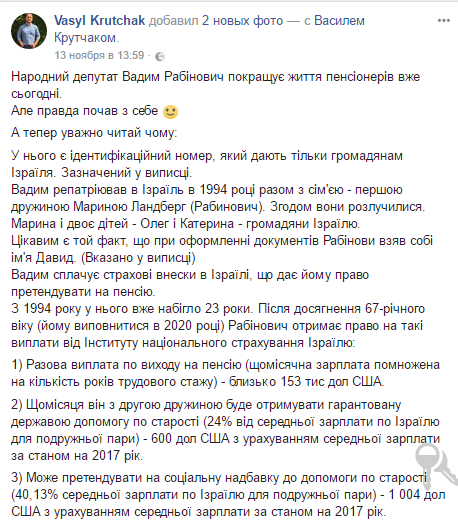 Если судить по этим данным, с 1994 года у Рабиновича него уже набежало 23 года. "После достижения 67-летнего возраста (ему исполнится в 2020 году) Рабинович получит право на такие выплаты от Института национального страхования Израиля" - написал Крутчак.