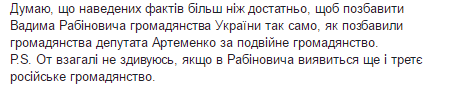 "У нас есть конституция - у нас одно гражданство. Двойных стандартов быть не должно. Все мы помним господина Артеменко, как только у него обнаружили второе гражданство - он перестал быть гражданином Украины, не является народным депутатом. Так что если правоохранительные органы подтвердят информацию, что у господина Рабиновича двойное гражданство - он должен перестать быть гражданином Украины, и перестать быть депутатом парламента Украины," - говорит Дмитрий Лубинец, секретарь регламентного комитета Верховной рады Украины. "Лишать депутатского мандата однозначно. Самые высокие должностные лица не могут иметь двойное гражданств точка. Лишение мандата", - говорит Роман Семенуха, народный депутат от "Самопомич".