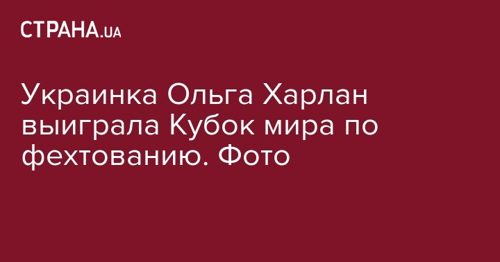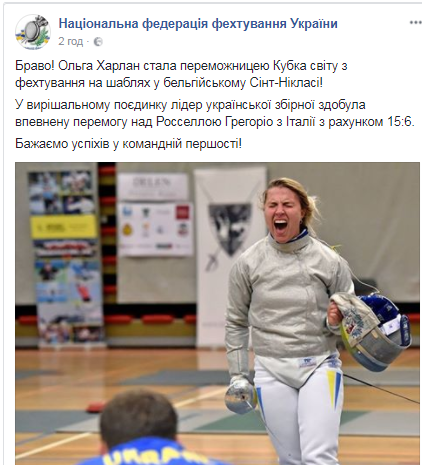 "Браво! Ольга Харлан стала победительницей Кубка мира по фехтованию на саблях в бельгийском Синт-Никлас! В решающем поединке лидер украинской сборной одержала уверенную победу над Росселлой Грегорио из Италии со счетом 15 - 6. Желаем успехов в командном первенстве", - говорится в сообщении Федерации фехтования.