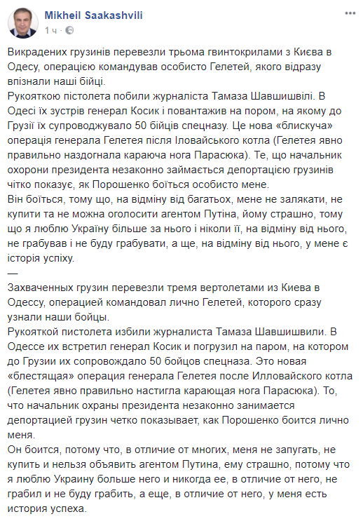 "Рукояткой пистолета избили журналиста Тамаза Шавшишвили. В Одессе их встретил генерал Косик и погрузил на паром, на котором до Грузии их сопровождало 50 бойцов спецназа. Это новая «блестящая» операция генерала Гелетея после Илловайского котла (Гелетея явно правильно настигла карающая нога Парасюка). То, что начальник охраны президента незаконно занимается депортацией грузин четко показывает, как Порошенко боится лично меня", - утверждает Саакашвили.