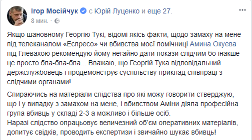 "Опираясь на материалы следствия о которых могу говорить утверждаю, что и в случае с покушением на меня, и убийством Амины действовала профессиональная группа убийц в составе 2-3 а возможно и более человек", - пишет Мосийчук.