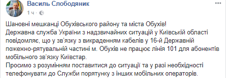 "В связи с похищением кабелей в 16-й Государственной пожарно-спасательной части города Обухов не работает линия "101" для абонентов мобильной связи "Киевстар".