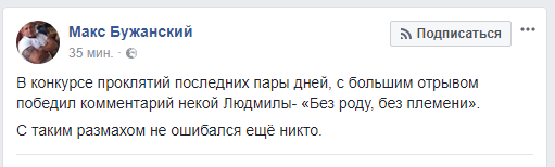 "В конкурсе проклятий последних пары дней, с большим отрывом победил комментарий некой Людмилы- "Без роду, без племени". С таким размахом не ошибался ещё никто", - пишет Бужанский.