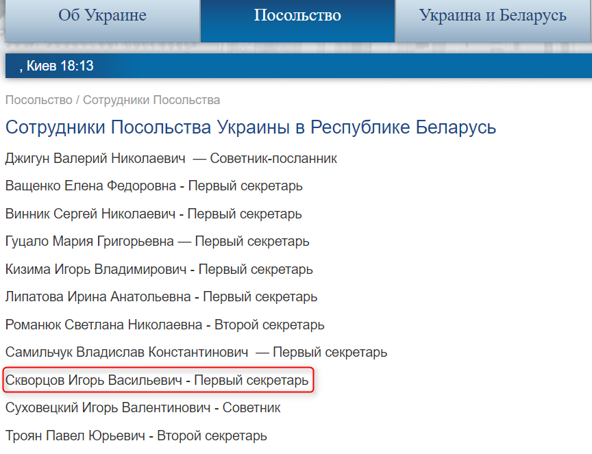 Отметим, что на сайте украинского посольства в РБ Скворцов уже исчез, но в кеше Google он остался.