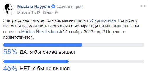 А "застрельщик" Евромайдана Мустафа Найем создал в Facebook опрос - согласились бы его подписчики выйти на Майдан тогда, в 2013 году, зная, чем все окончится?
