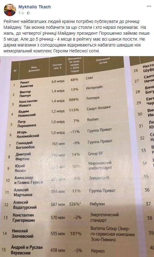"Рейтинг самых богатых людей страны нужно публиковать к годовщине Майдана. Так можно увидеть, за что стояли и кто сейчас побеждает. К сожалению, к четвертой годовщине Майдана президент Порошенко занимает лишь 5 место. Но до 5 годовщины - 4 место в рейтинге имеет все шансы занять. Не зря магазины со сладостями открываются гораздо быстрее мемориального комплекса Героям Небесной сотни".