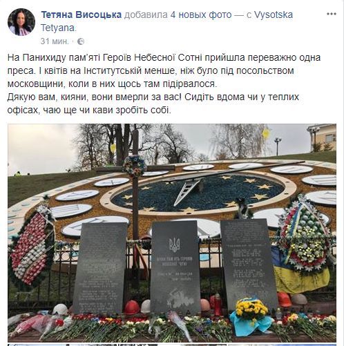 "На панихиду памяти Героев Небесной Сотни пришла преимущественно одна пресса. И цветов на Институтской меньше, чем под посольством Московщины, когда у них что-то там взорвалось. Спасибо, киевляне, они умерли за вас! Сидите дома или в теплых офисах, чая еще или кофе сделайте себе".