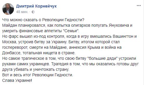 Но самое трагическое в том, что свою битву "большие дяди" устроили руками самих украинцев. Трагедия в том, что мы оказались готовы друг друга убивать и уничтожать страну. Вот и весь итог Революции Гидности. Слава Украине!"