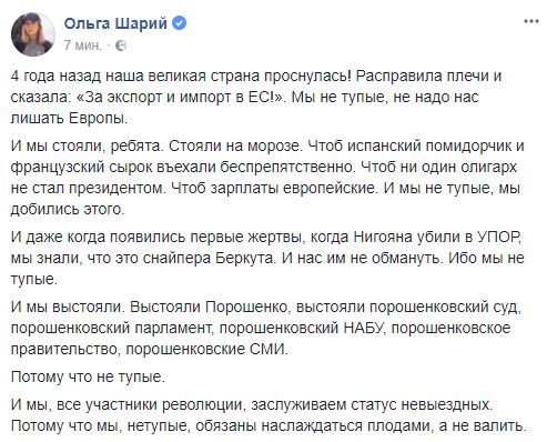 Журналист Ольга Шарий объясняет, почему участникам Майдана нужно закрыть выезд из страны: "4 года назад наша великая страна проснулась! Расправила плечи и сказала: "За экспорт и импорт в ЕС!". Мы не тупые, не надо нас лишать Европы.