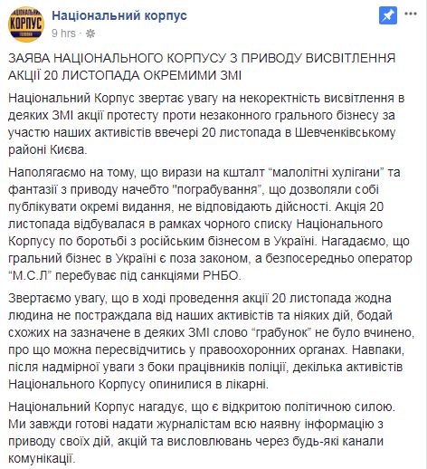 "Акция 20 ноября проходила в рамках черного списка "Нацкорпуса" по борьбе с российским бизнесом в Украине. Напомним, что игорный бизнес в Украине вне закона, а непосредственно оператор "М.С.Л" находится под санкциями СНБО. Впереди еще много интересных вечеров. "Национальный корпус" не оставит борьбу", – заявляют в пресс-службе.