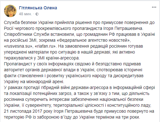 СБУ выдворила из Украины российского журналиста Игоря Петрашевича, которого спикер ведомства Елена Гитлянская называет "прокремлевским пропагандистом". Об этом она сообщила в Facebook.
