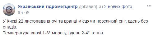 "Завтра, 22 ноября, в Украине облачно. В восточных областях ночью и утром сильный мокрый снег, местами налипание мокрого снега, днем без осадков; на дорогах гололедица; температура в течение суток около 0°. На остальной территории без осадков, лишь на Закарпатье и Прикарпатье мокрый снег и дождь, в северной части ночью и утром местами небольшой снег", - говорится в сообщении.